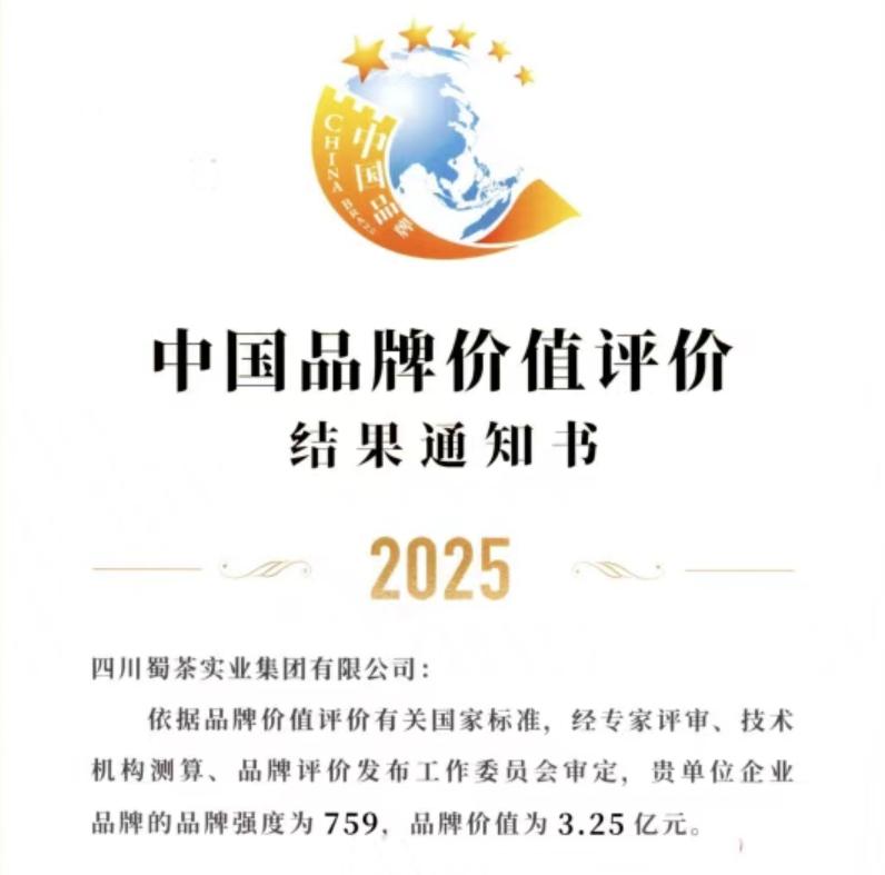近日,由中國品牌建設促進會、中國資產評估協會主辦,新華社品牌工作辦公室、《中國品牌》雜志社等單位承辦的“2025中國品牌價值評價信息”在浙江德清正式發布。經專家評審、技術機構測算、品牌評價發布工作委員會審定,蜀茶集團品牌的品牌強度為759,品牌價值為3.25億元。